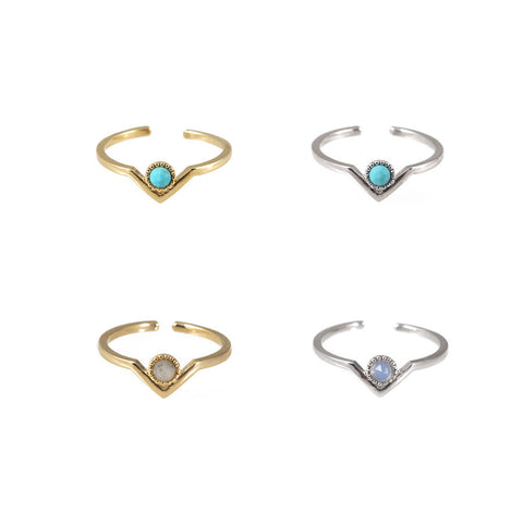 The Zeta Ring is a style inspired by a free spirited sunseeker. With sleek modern lines, accented with petite turquoise gemstones, this adjustable piece is made for layering. Styled with the Triple-Zeta Ring to create the ultimate ring stack. Features 24K plating.